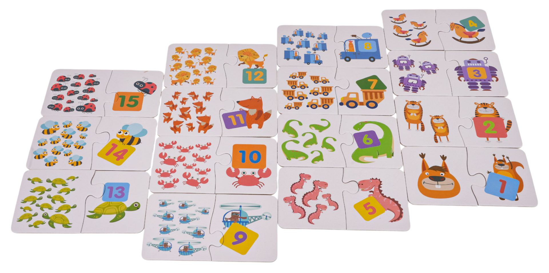 – 30 puzzli – 15 obrazków z cyferką i 15 puzzli różną ilością zwierzątek |