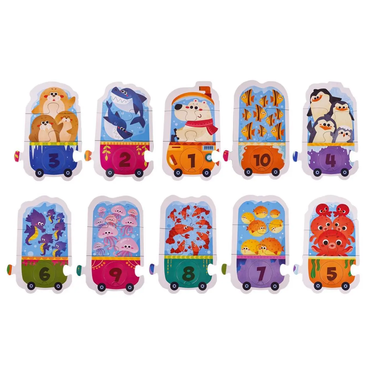 Gra edukacyjna, matematyczna Wagonik dla dzieci od 3-go roku życia. Gra składa się z 40 elementów. Zadaniem gracza jest ułożyć pociąg składający się z 10 wagoników. Każdemu wagonikowi, dziecko musi przyporządkować cyferkę oraz obrazek z ilością zwierzątek odpowiadający cyferce wagonika. Gra uczy logicznego myślenia, spostrzegawczości oraz rozpoznawania cyferek w zakresie 1 do 10. Opakowanie posiada wygodną rączkę do przenoszenia, tak by dziecko mogło zabrać ją wszędzie ze sobą. Funkcje